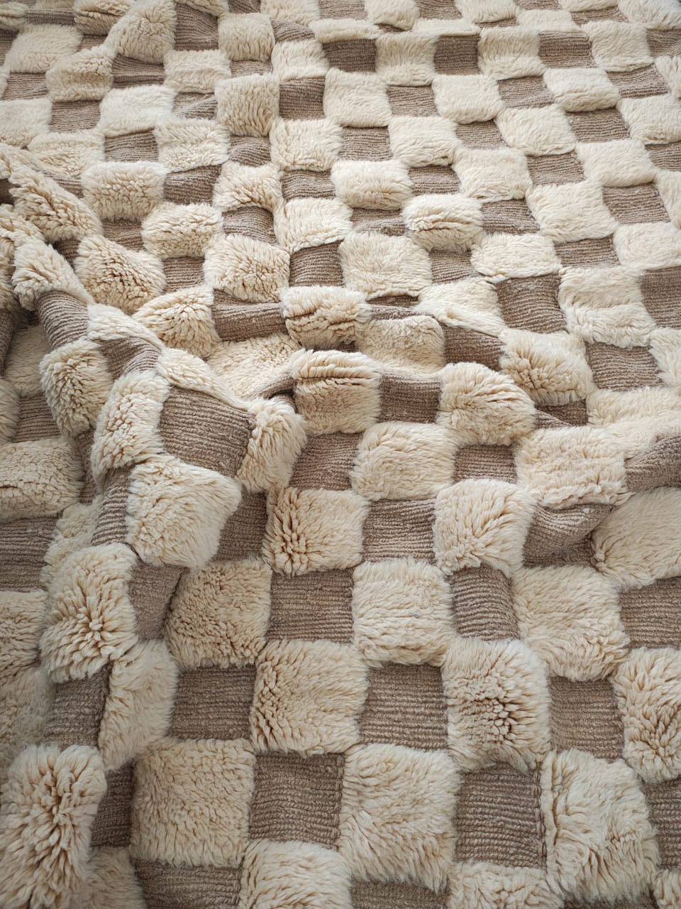 Dywany Beni Mrirt to jedne z najbardziej cenionych marokańskich dywanów, znane z ręcznego wykonania i najwyższej jakości naturalnej wełny. Tkane w górach Atlasu przez kobiety plemion Amazygów, od wieków stanowią wyraz tradycji, kultury i niepowtarzalnego rzemiosła. Ten model w rozmiarze 3,15 x 2,15 m + frędzle zachwyca swoim jasnym, naturalnym odcieniem oraz charakterystycznym wzorem w szachownicę, który nadaje mu nowoczesnego, a zarazem ponadczasowego charakteru.