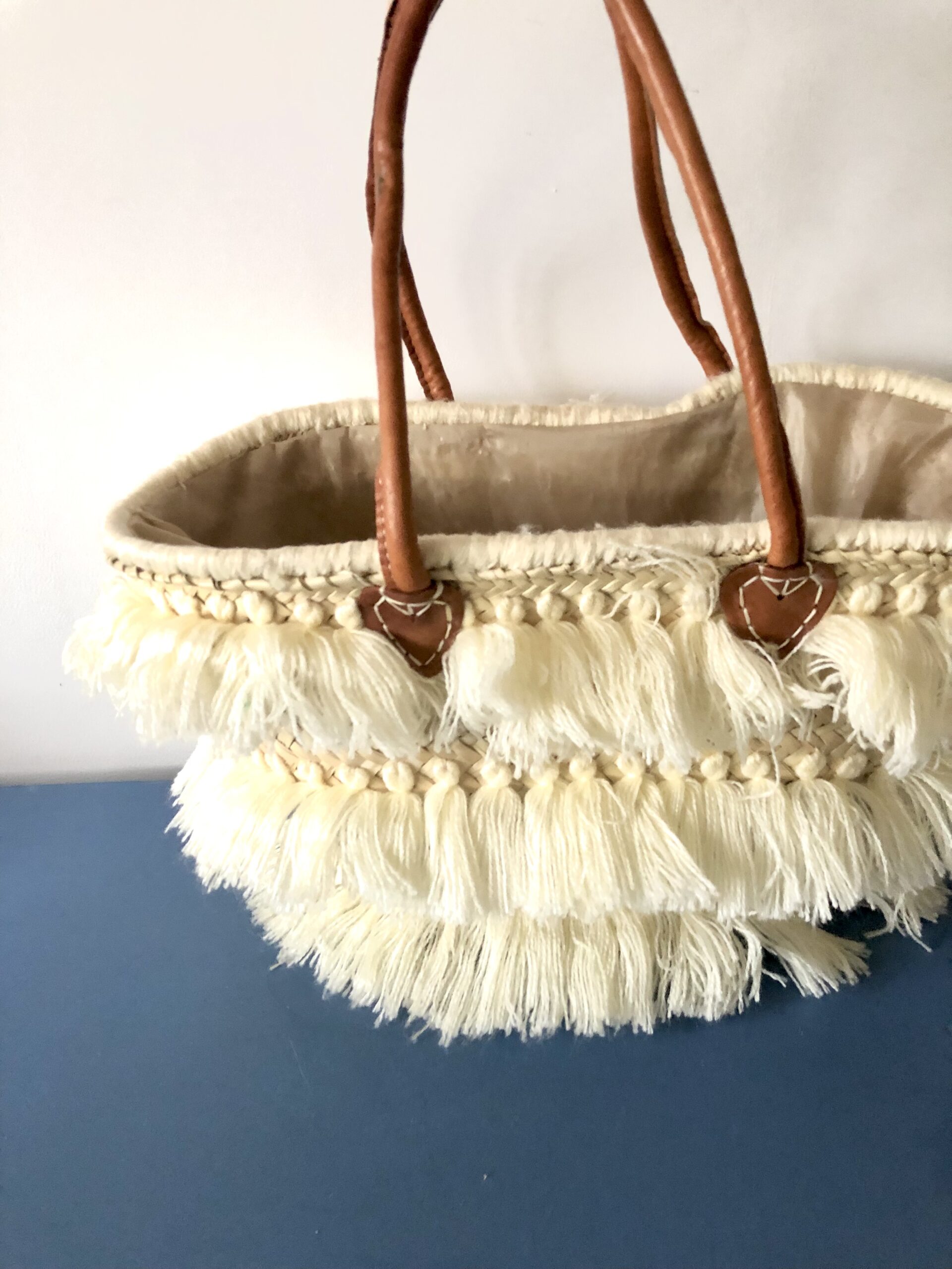 Materiał – kosz z rafii & rączki ze skóry / frędzle bawełniane